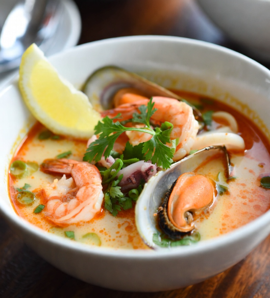 Острый и ароматный суп на основе кокосового молока с пастой том ям, шампиньонами, томатами черри, кальмаром, мидиями и креветкой. С яркими нотами имбиря и сока лайма. Взрыв вкуса Таиланда в каждой ложке.