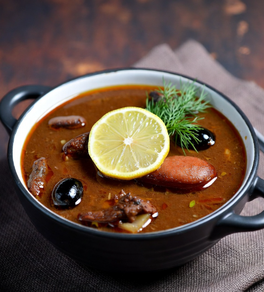 Насыщенный мясной суп с копчёностями, солёными огурцами, маслинами и каперсами. С яркой кислинкой и сметаной. Классика, которая согреет и насытит.
