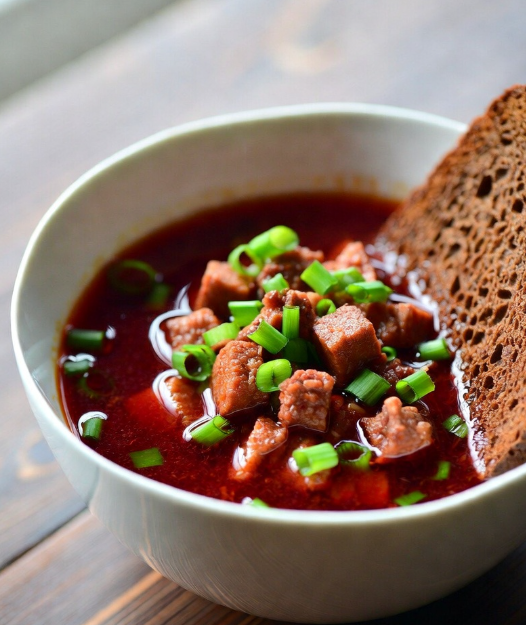 Наваристый свекольный суп с говядиной, овощами и душистыми специями. Подаётся со сметаной и свежей зеленью. Классика, которая пахнет домом.