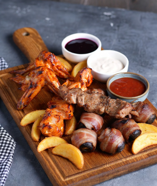 Крылья острые, шашлык куриный, шашлык свиной, шампиньоны в беконе, картофельные дольки, соус: смородина, красный, чесночный